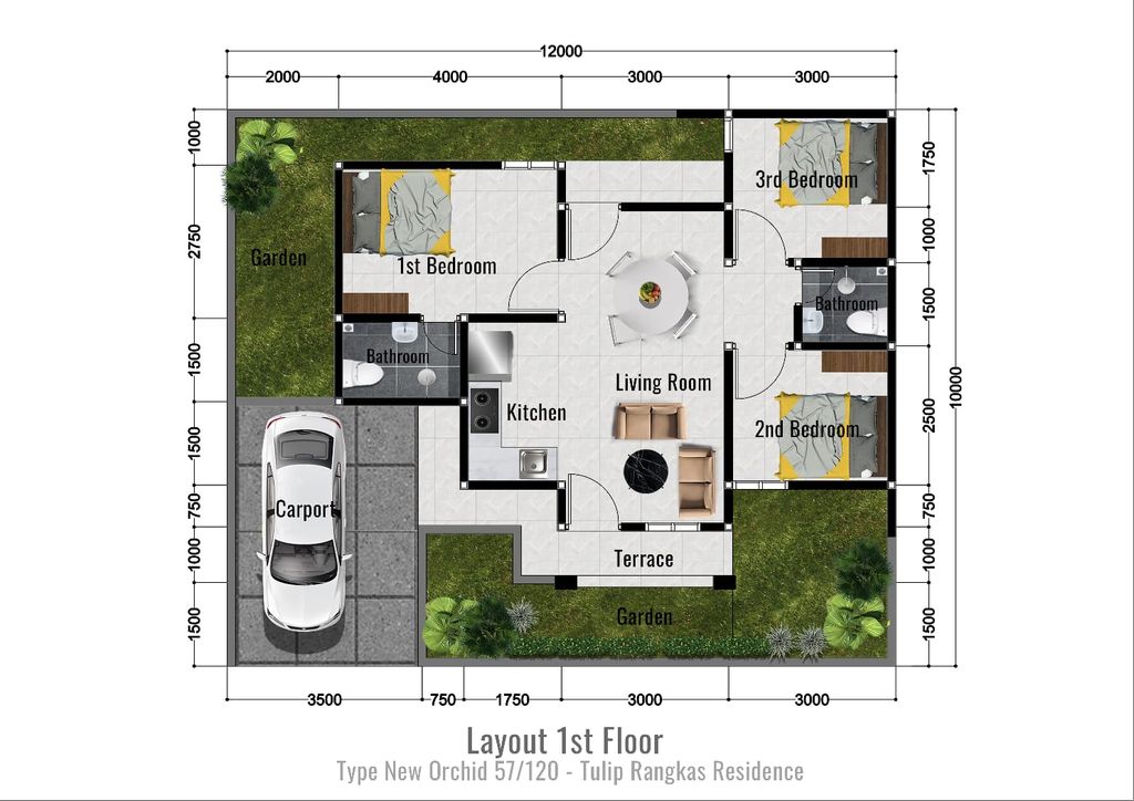 Tulip Rangkas Residence Tipe Orchid merupakan tipe rumah 1 lantai yang dilengkapi dengan 3 kamar tidur, 2 kamar mandi, ruang keluarga, ruang makan, dapur, dan carport untuk 1 mobil. Tipe Orchid memiliki luas bangunan 57 meter persegi dan luas tanah 120 meter persegi, harga yang ditawarkan mulai dari IDR 605 jt.